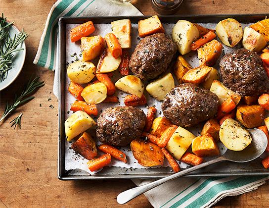 Remove pan from oven; stir vegetables and place meatloaves in between vegetables. Roast for 30 minutes or until instant-read thermometer inserted in centre of meatloaves reads 160°F (71°C) and vegetables are tender. Sprinkle with pepper.