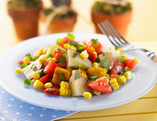 With sharp knife, cut kernels from corn cobs and place in large bowl. Add potatoes, charred peppers, tomatoes, green onions and coriander.