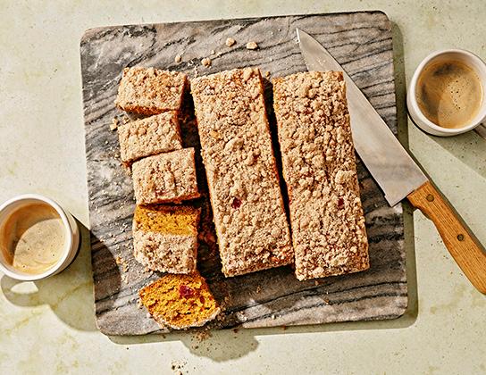 In medium bowl, whisk egg; whisk in brown sugar, orange rind, orange juice, milk and oil. Whisk in pumpkin purée. Pour over flour mixture and stir just until moistened. Spoon into greased 8-inch (20 cm) square metal cake pan. Sprinkle with topping.