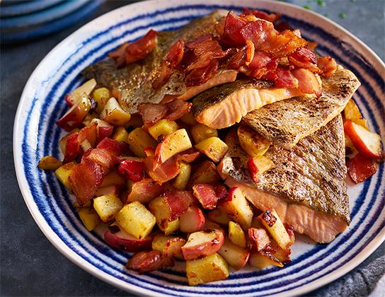 In large heavy-bottomed skillet, heat 1 tbsp (15 mL) of the oil over medium-low heat. Add bacon; cook, stirring frequently, until crisp. Remove; drain on paper towels. In same skillet add onion; cook, stirring, for about 3 minutes, until lightly browned. Add potatoes; cook, stirring frequently, for about 8 minutes, until brown and beginning to crisp. Add apples; cook for 2 to 3 minutes until warm. Season with salt and pepper. Just before serving add butter; stir in bacon.