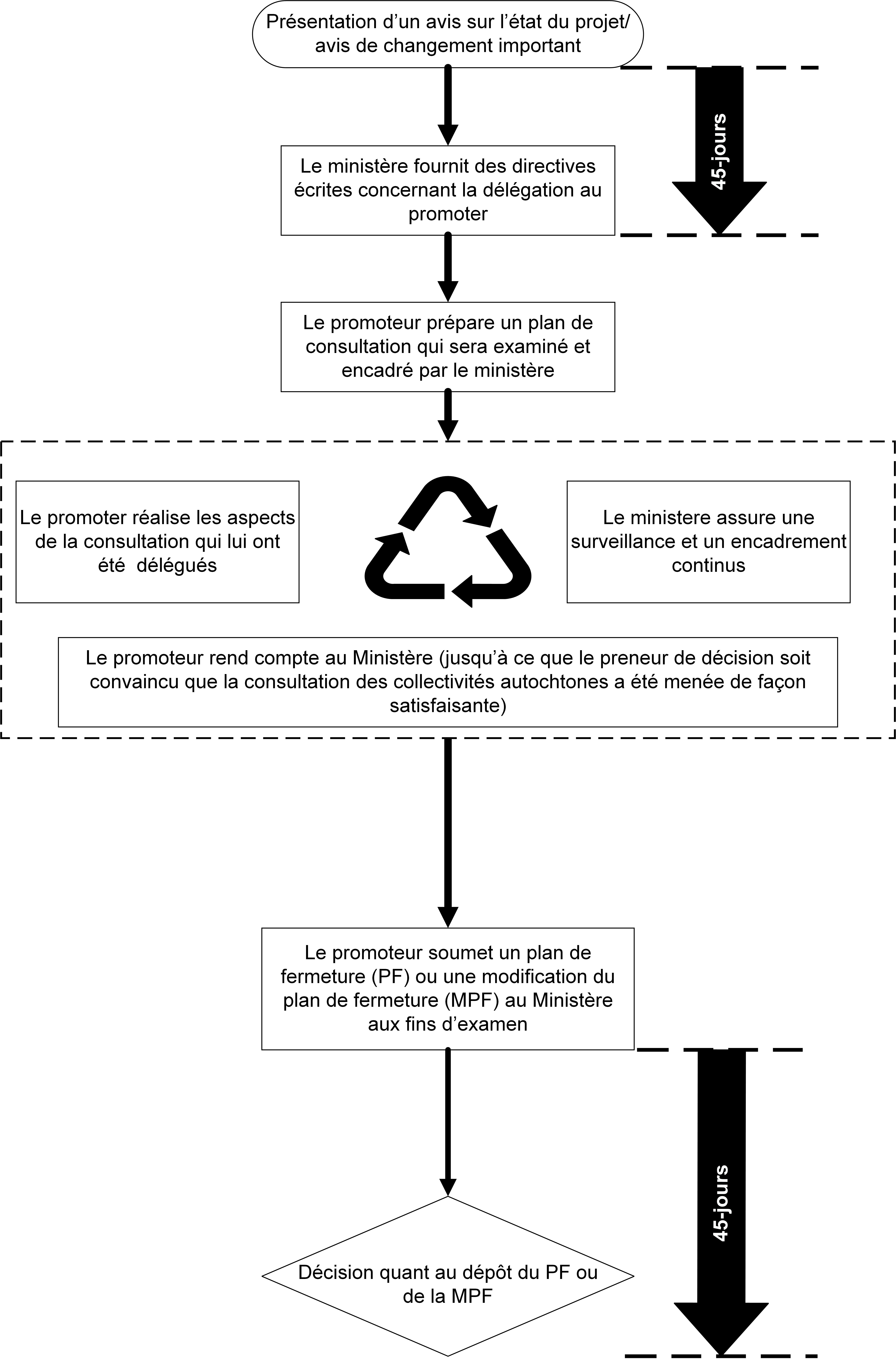 Le Ministère examinera le rapport de consultation, en discutera avec les collectivités autochtones qui ont été consultées et déterminera si d’autres directives au sujet de la consultation sont nécessaires. La consultation se poursuivra jusqu’à ce que le preneur de décision soit convaincu qu’une consultation appropriée des collectivités autochtones a été menée conformément aux règlements. Si le preneur de décision détermine que l’obligation de consulter de la Couronne a été honorée et, sur cette base, indique au promoteur qu’il n’y a pas lieu de donner d’autres directives sur la consultation, le promoteur peut procéder à la soumission du plan de fermeture ou de la modification du plan de fermeture aux fins d’une décision concernant le document à déposer. Le temps nécessaire pour mener à bien ce processus dépendra du projet, du promoteur et des collectivités concernées.