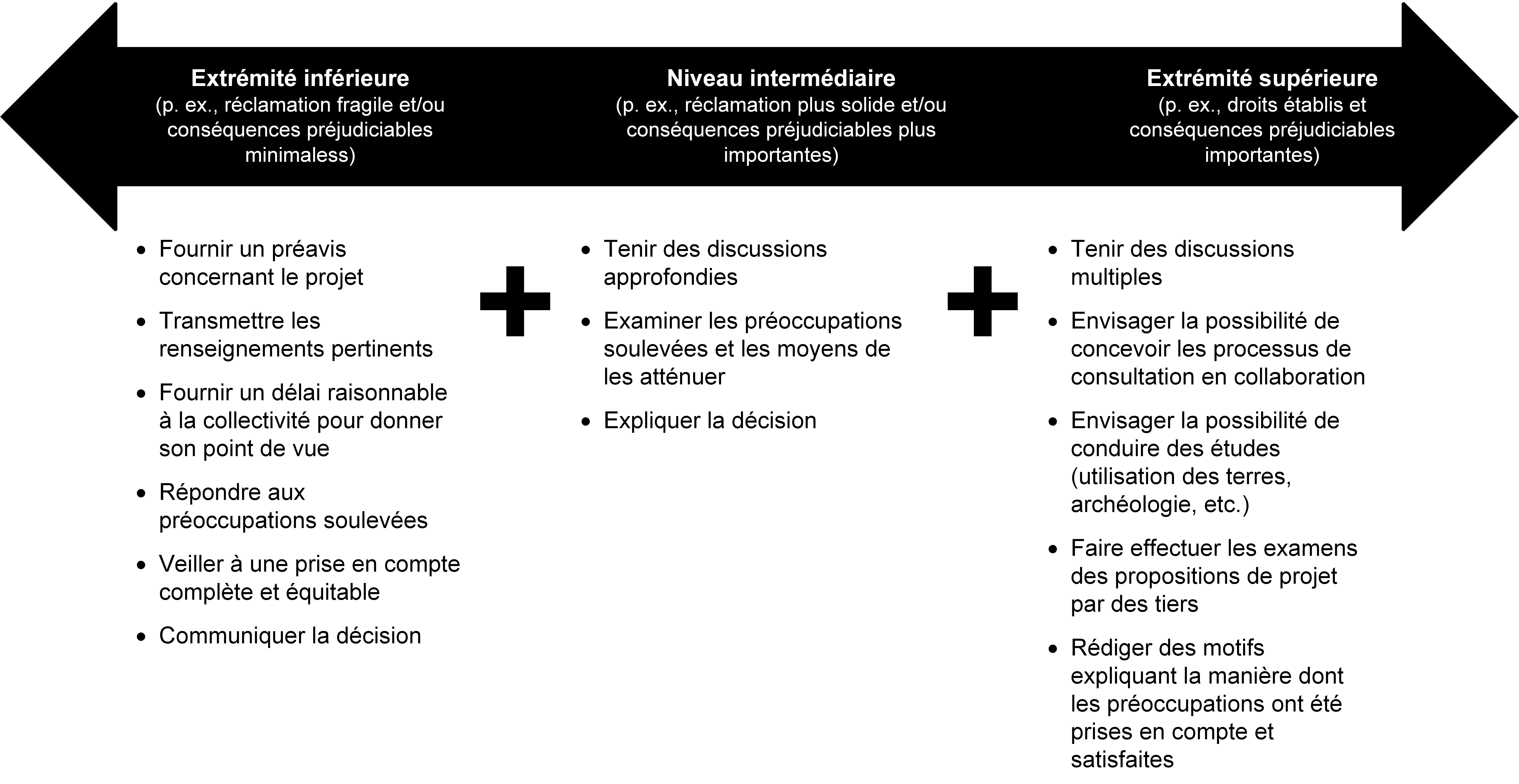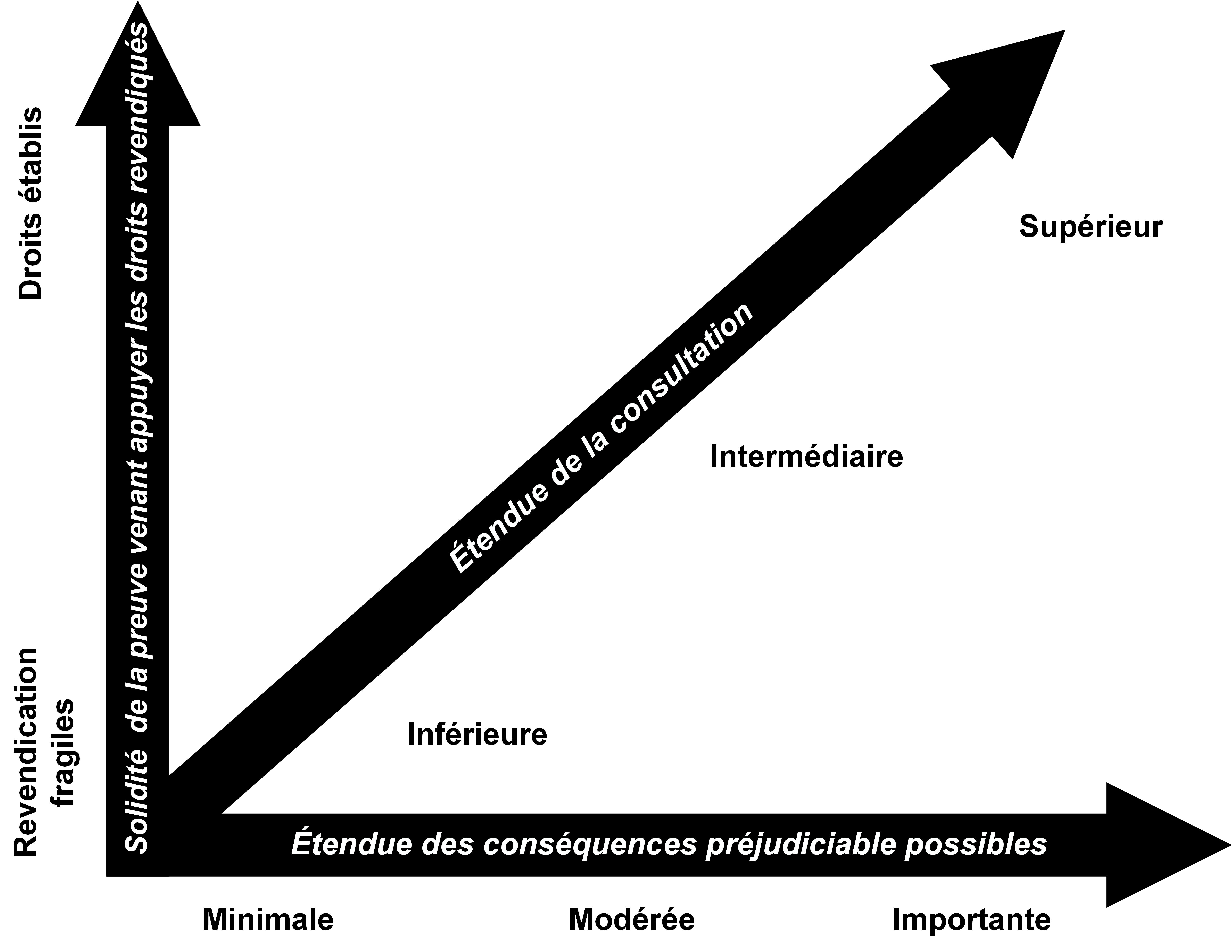 L’étendue ou le contenu de l’obligation de consulter peuvent être présentés sous forme d’un spectre. Le point où l’obligation se situe sur ce spectre est déterminé au cas par cas :