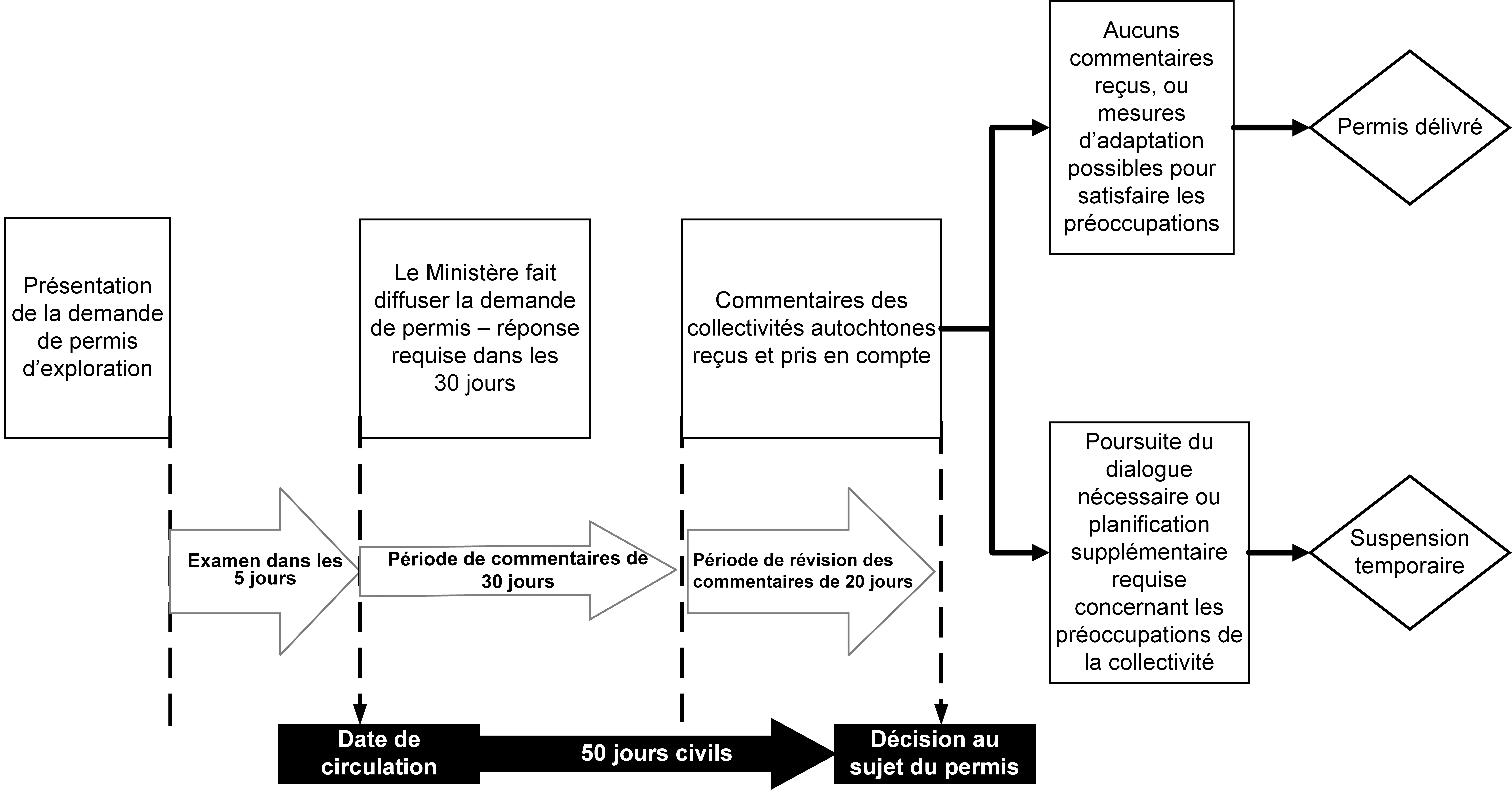 - les collectivités sont priées d’informer le Ministère de leurs préoccupations concernant les conséquences préjudiciables éventuelles sur les droits ancestraux ou issus de traités dans les 30 jours suivant la mise en circulation de la demande de permis d’exploration;