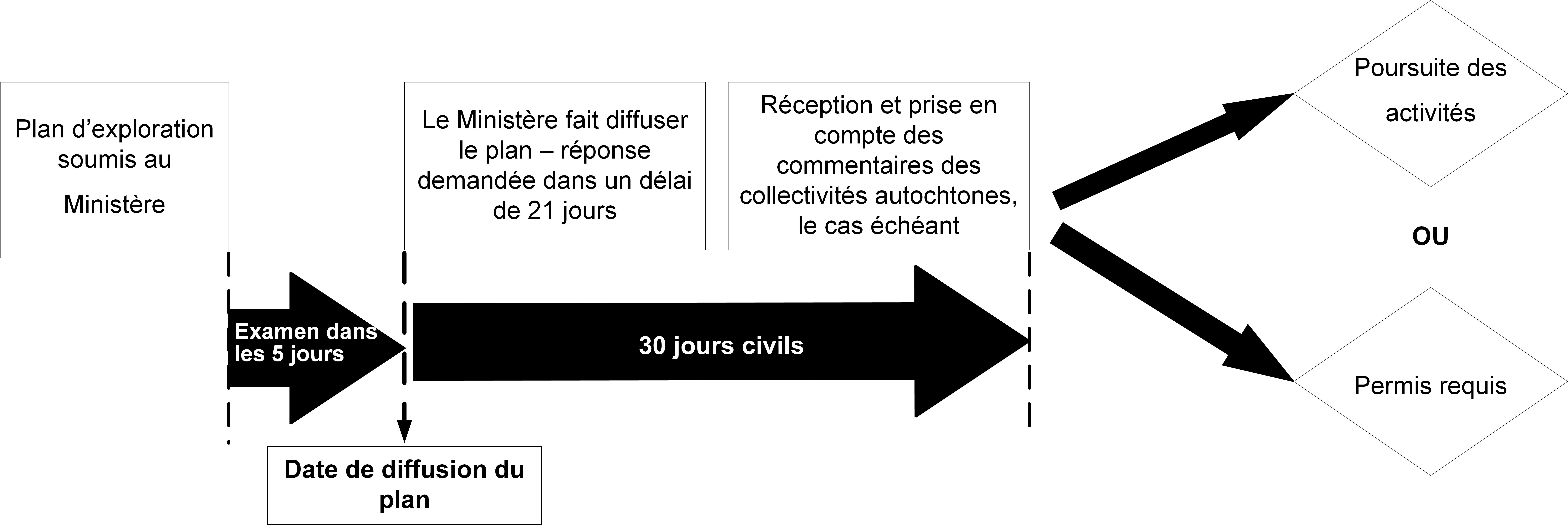 - lorsque les préoccupations propres au projet concernant les conséquences préjudiciables éventuelles sur les droits ancestraux ou issus de traités sont traitées à la satisfaction du preneur de décision (c.-à-d. un directeur de l’exploration, nommé en vertu de l’article 78 de la Loi sur les mines, ou le Ministère), et que le preneur de décision ne détermine pas qu’un permis d’exploration est nécessaire pour d’autres raisons, le plan d’exploration soumis sera suffisant pour permettre la réalisation des activités proposées. Le promoteur peut commencer les activités couvertes par le plan d’exploration soumis 30 jours après la date de circulation
