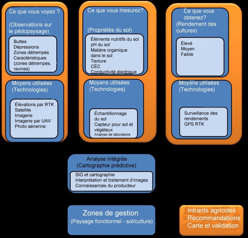 Les données en couches sont saisies à l'aide d'outils de traitement intégrés utilisés commercialement ou en recherche pour produire des cartes des zones de gestion. Un défi consiste à déterminer les couches qui sont nécessaires et ce qu'il faut faire si l'on ne dispose pas de certaines couches clés, comme des cartes de rendement pluriannuelles.