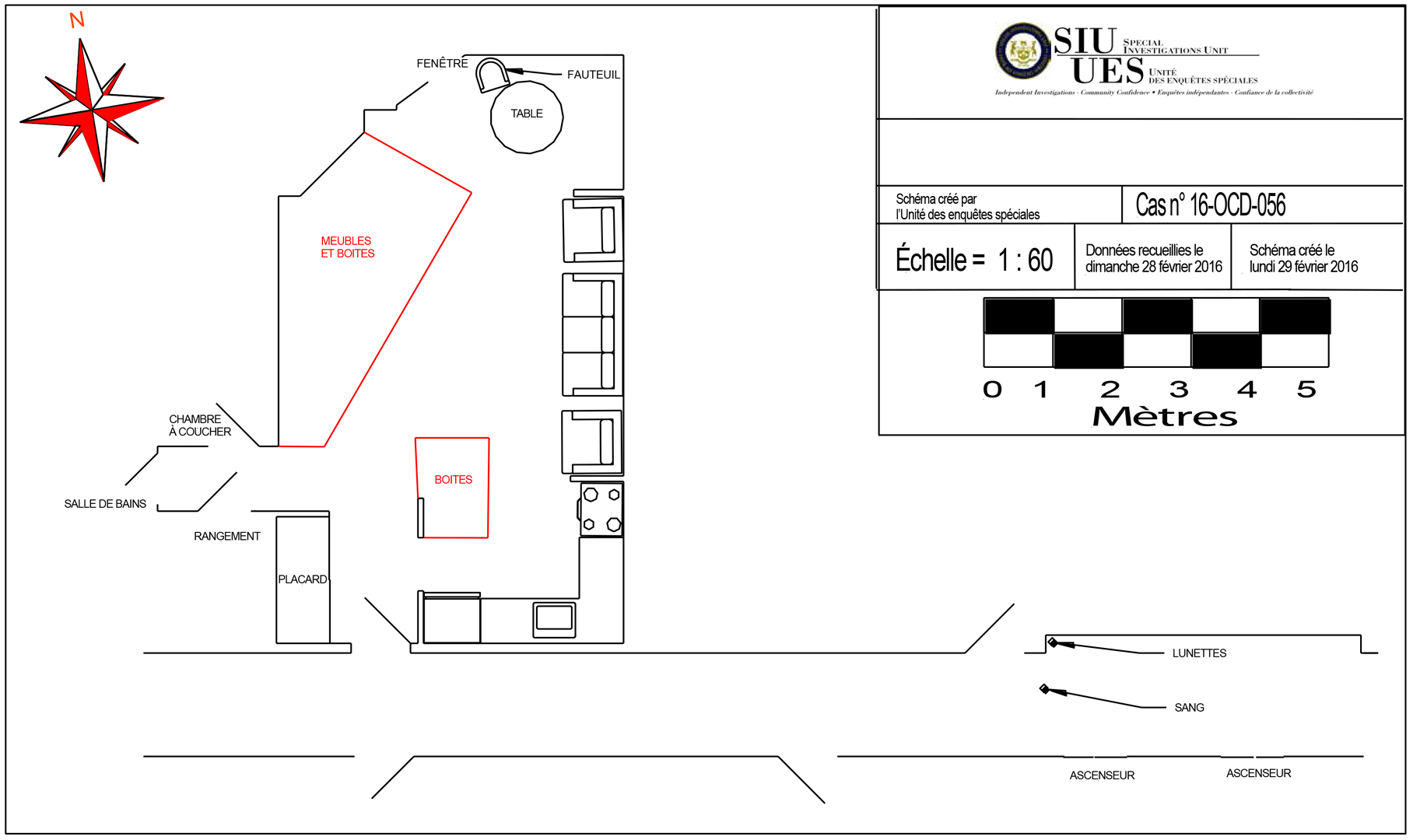 Il y avait divers endroits associés à cet incident, dont le corridor du neuvième étage avec des taches de sang, la moustiquaire et le seuil d’une fenêtre à l’intérieur de l’appartement, ainsi que le sol à l’extérieur du bâtiment, sur la rue Sidney, au-dessous de l’appartement du 9e étage, où le plaignant a atterri. Les spécialistes des sciences judiciaires de l’UES ont pris des photos et des vidéos de ces trois endroits. Un schéma du corridor du 9e étage et de l’intérieur de l’appartement a été effectué.