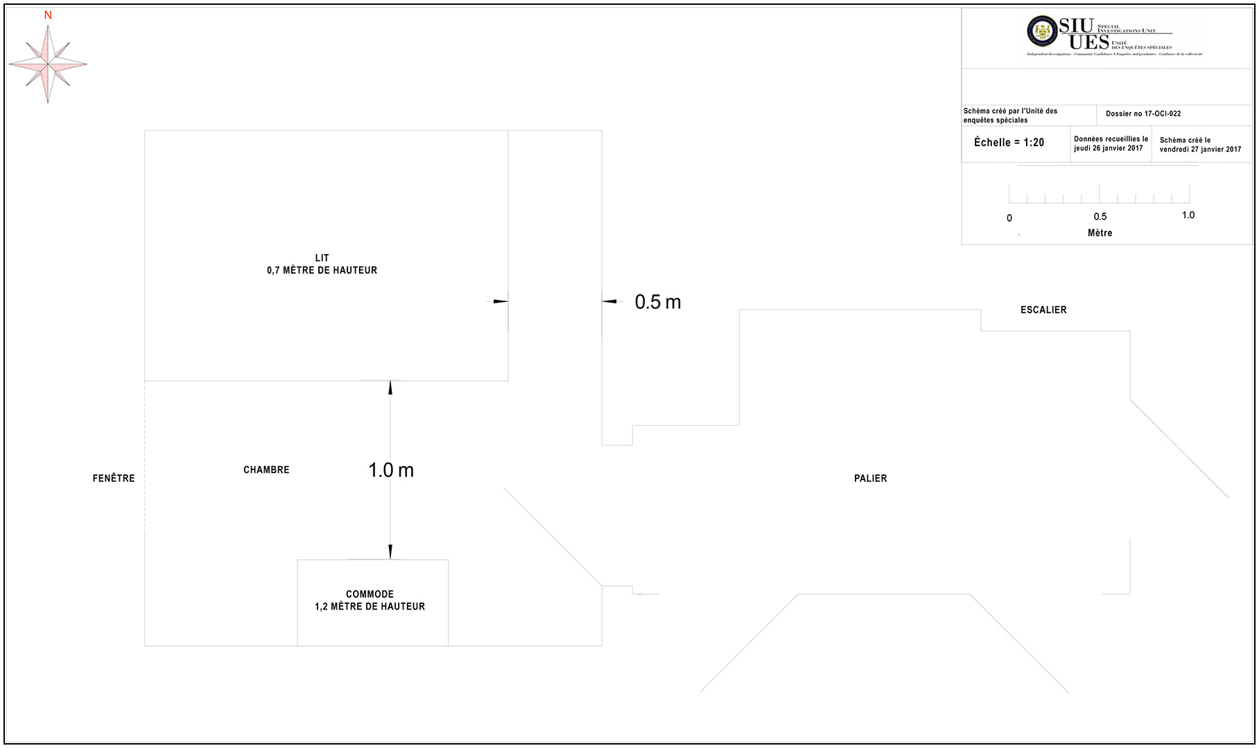 Les enquêteurs judiciaires de l’UES se sont rendus sur les lieux de l’incident et ont repéré et préservé les éléments de preuve. Ils ont documenté les lieux pertinents de l’incident au moyen de notes, de photographies, de croquis et de mesures.