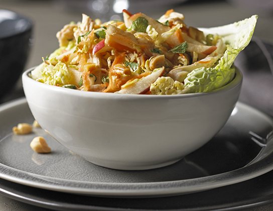 Ajouter au poulet le chou, la carotte, la pomme, la coriandre, la menthe et la moitié des arachides. Dans un petit bol, mélanger le reste de la sauce de poisson, le vinaigre, le sucre, le jus de limette, la sriracha et l’ail; remuer pour dissoudre le sucre. Verser la vinaigrette sur la salade et mélanger pour bien enrober. Couvrir et réfrigérer pendant au moins 1 heure pour permettre aux saveurs de se mélanger. Servir parsemé du reste des arachides.