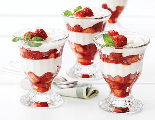 Couper les fraises en tranches; en mettre une partie de côté pour la garniture. Disposer les fraises et le mélange de chocolat en couches successives dans les verres à parfait. Garnir avec les fruits rouges mis de côté et les feuilles de menthe. Servir ou réfrigérer couvert pendant 2 heures maximum.