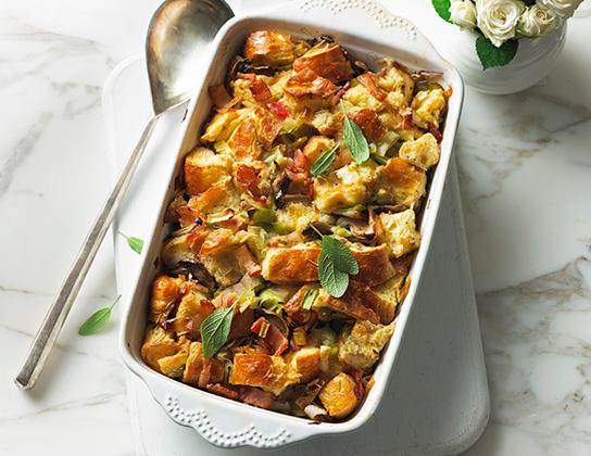 Dans une grande poêle, à feu mi-vif, cuire le bacon, en remuant de temps en temps, jusqu’à ce qu’il soit partiellement cuit. Avec une cuiller à égoutter, ajouter le bacon aux cubes de pain. Baisser le feu à moyen, ajouter les poireaux et les champignons dans la poêle et cuire, en remuant souvent, jusqu’au ramollissement, pendant environ 5 minutes. Ajouter les cubes de pain.