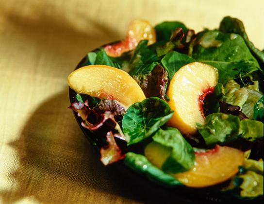 Déchiqueter les feuilles de salades en petits morceaux. Les mettre dans un saladier avec les pêches, les prunes ou les nectarines et les fines herbes. La salade peut être préparée la veille sans les fruits, qui seront ajoutés juste avant d'arroser de vinaigrette.