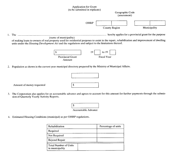 2. (1) No later than July 16, 1993, the Minister may make annual grants up to an amount based on the population of the municipality as shown in the municipal directory prepared by the Ministry of Housing for the year in which the grants are made multiplied by the appropriate amount as set out in Schedule 1 to municipalities that make application for a grant in accordance with Form 1 and attach with the application,