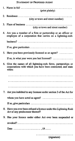 59. An application for a licence to act as an agent to offer for sale, sell and install lightning rods shall be in Form 3. R.R.O. 1990, Reg. 712, s. 59.