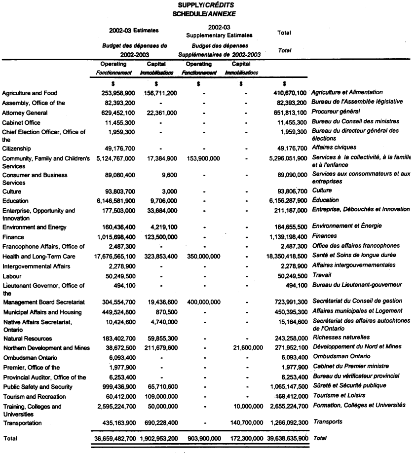 Messages from the Honourable the Lieutenant Governor of the Province of Ontario, accompanied by estimates and supplementary estimates, indicate that the amounts mentioned in the Schedule are required to pay expenses of the public service of Ontario that are not otherwise provided for, for the fiscal year ending on March 31, 2003.