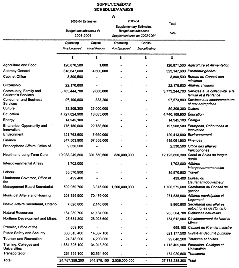 2. (1) For the period from April 1, 2003 to March 31, 2004, amounts not exceeding a total of $27,738,238,300 may be paid out of the Consolidated Revenue Fund or incurred as non‑cash expenses to be applied to the expenses of the public service, as set out in Schedule A to this Act, that are not otherwise provided for and the money shall be applied in accordance with the votes and items of the estimates and supplementary estimates. 2003 c. 10, s. 2 (1).