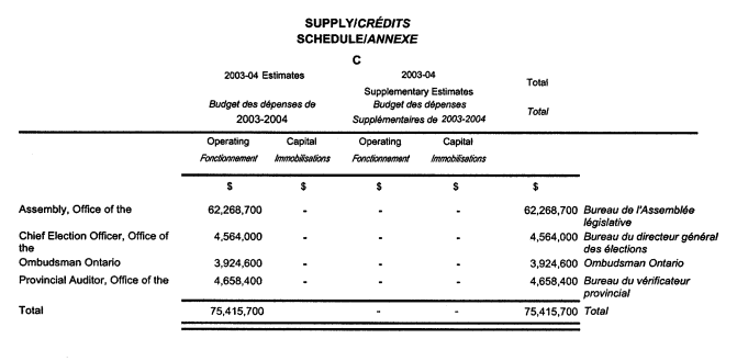 (3) For the period from April 1, 2003 to March 31, 2004, amounts not exceeding a total of $75,415,700 may be paid out of the Consolidated Revenue Fund to be applied to the expenses of the Legislative Offices, as set out in Schedule C to this Act, that are not otherwise provided for and the money shall be applied in accordance with the votes and items of the estimates and supplementary estimates.