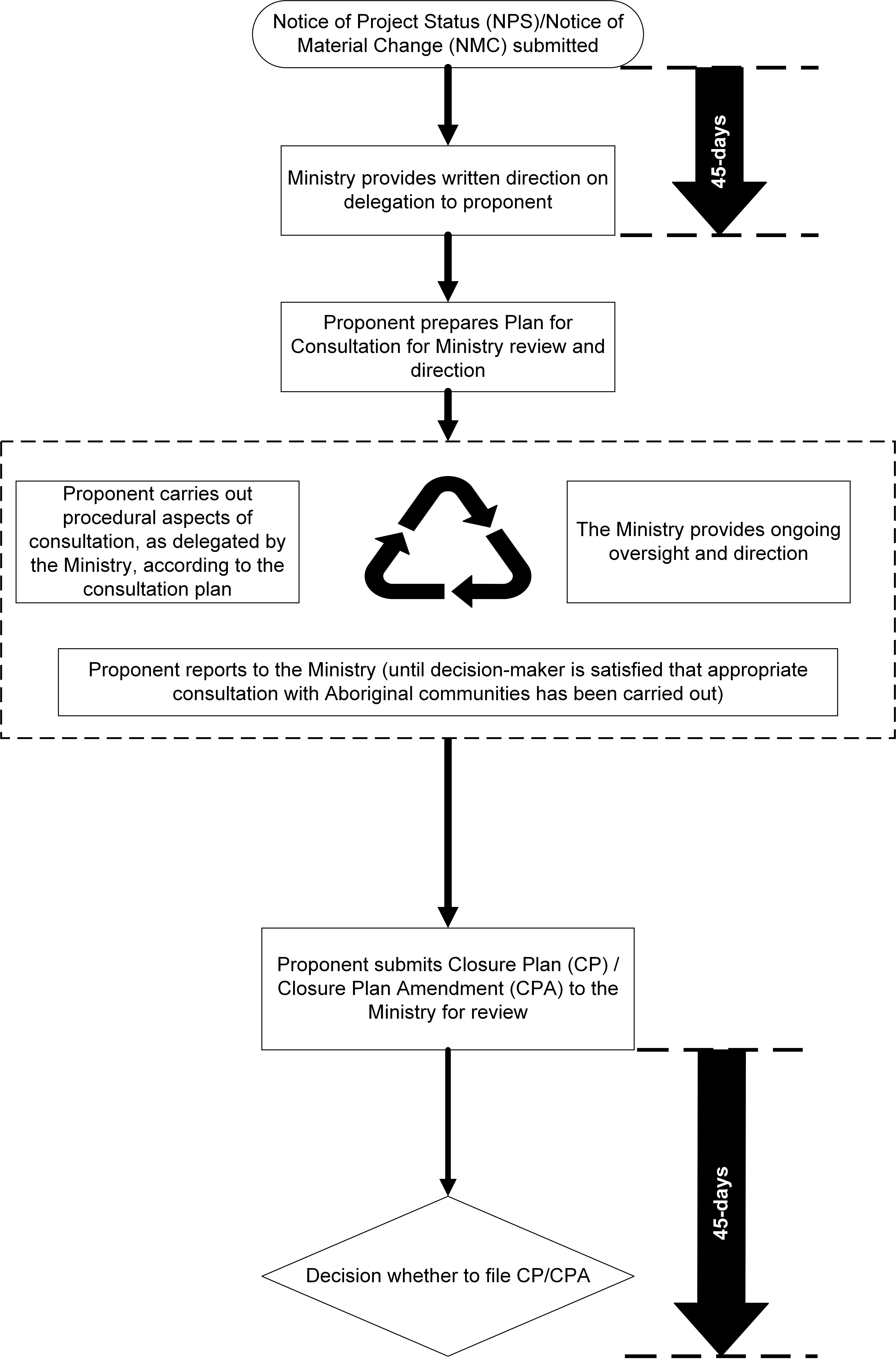 The ministry will review the consultation report, discuss the report with the Aboriginal communities that were consulted, and determine if further direction on consultation is required. Consultation will be carried out until the decision-maker is satisfied that appropriate consultation with Aboriginal communities has been carried out in accordance with the regulation. If the decision-maker determines that the Crown’s duty to consult has been satisfied, and on that basis indicates to the proponent that no further direction on consultation is provided, the proponent may proceed to submit the Closure Plan or Closure Plan Amendment for a filing decision. The time it may take to carry out the process will depend on the project, the proponent and the communities involved.