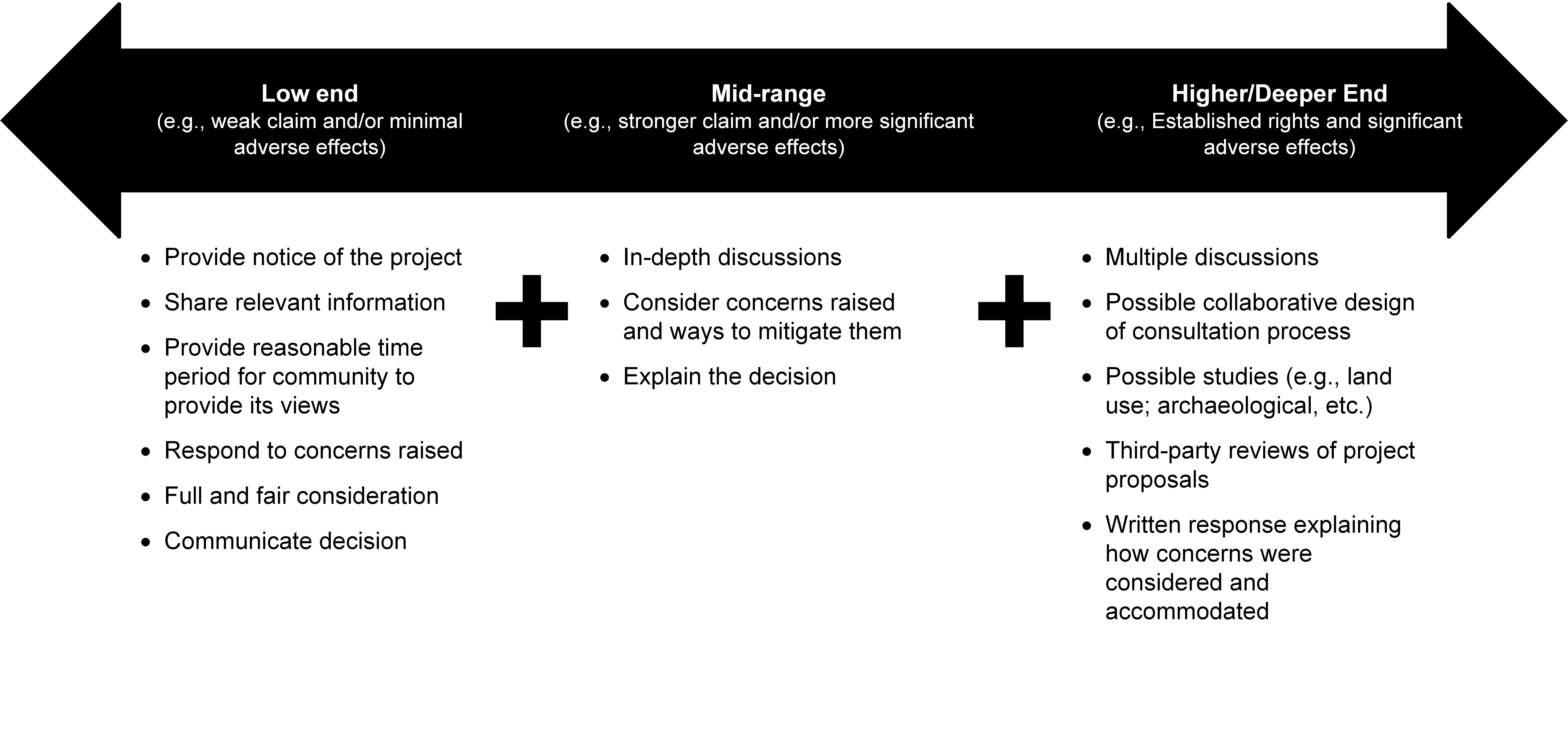 Consultation undertaken by the ministry or by proponents, where procedural aspects of consultation has been delegated, will be proportional in scope and depth to the scale and nature of the proposed activities. This may not always align with the expectations of the communities. Consultation falls on a spectrum — what may be appropriate for a large-scale project will not be appropriate for earlier exploration activities and vice versa.
