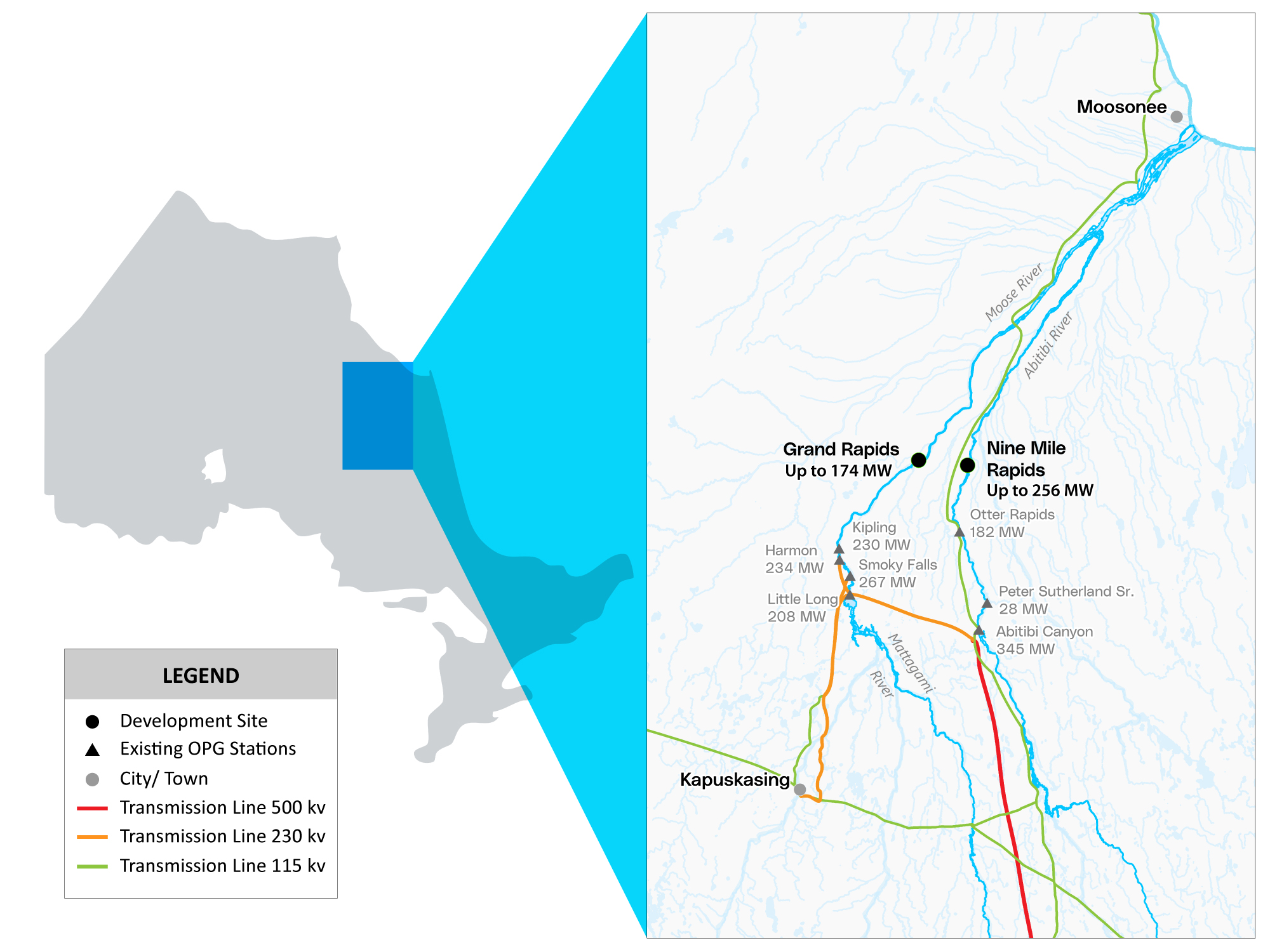 In April 2025, the government announced plans to pursue new hydroelectric development in northern Ontario, co-planned with Indigenous partners. Taykwa Tagamou Nation (TTN) and Moose Cree First Nation (MCFN) are leading the early-stage planning of two potential hydroelectric generating stations — Nine Mile Rapids and Grand Rapids — which together could provide up to 430 MW of clean, reliable electricity (See Chapter 2).